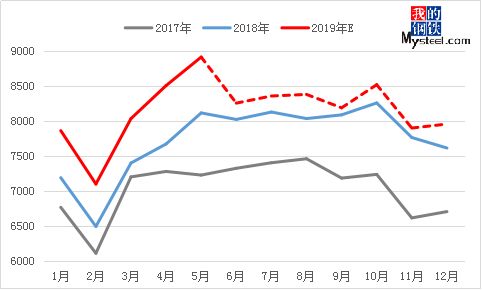 圖3:2017-2019年全國(guó)粗鋼月產(chǎn)量(單位:萬(wàn)噸)